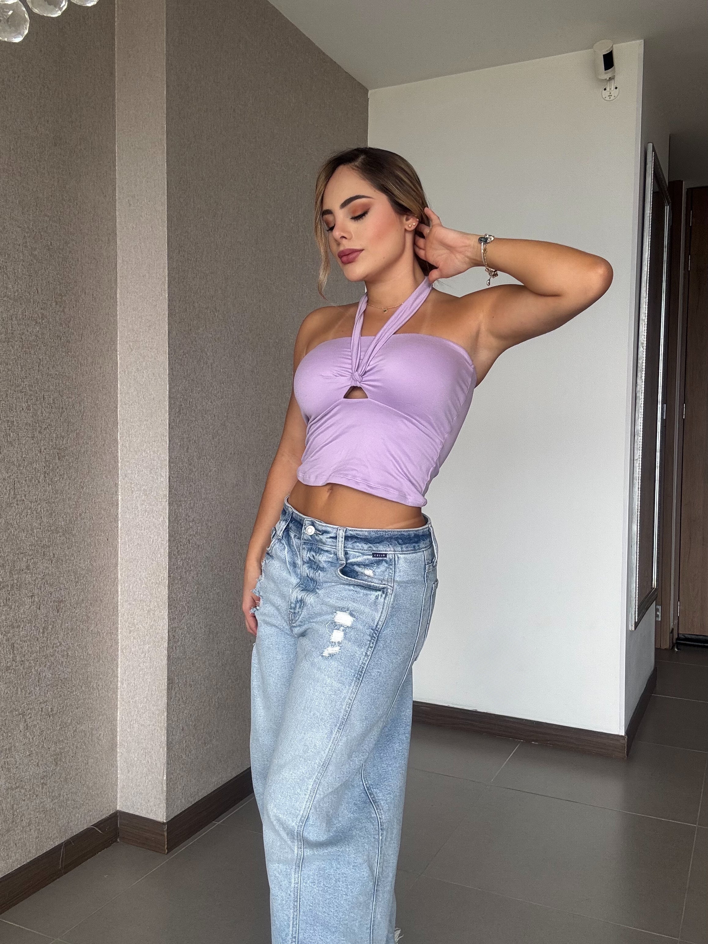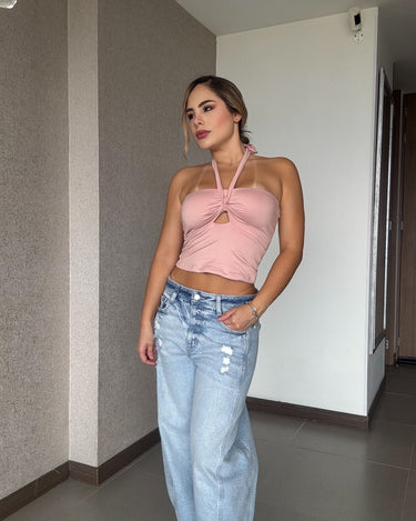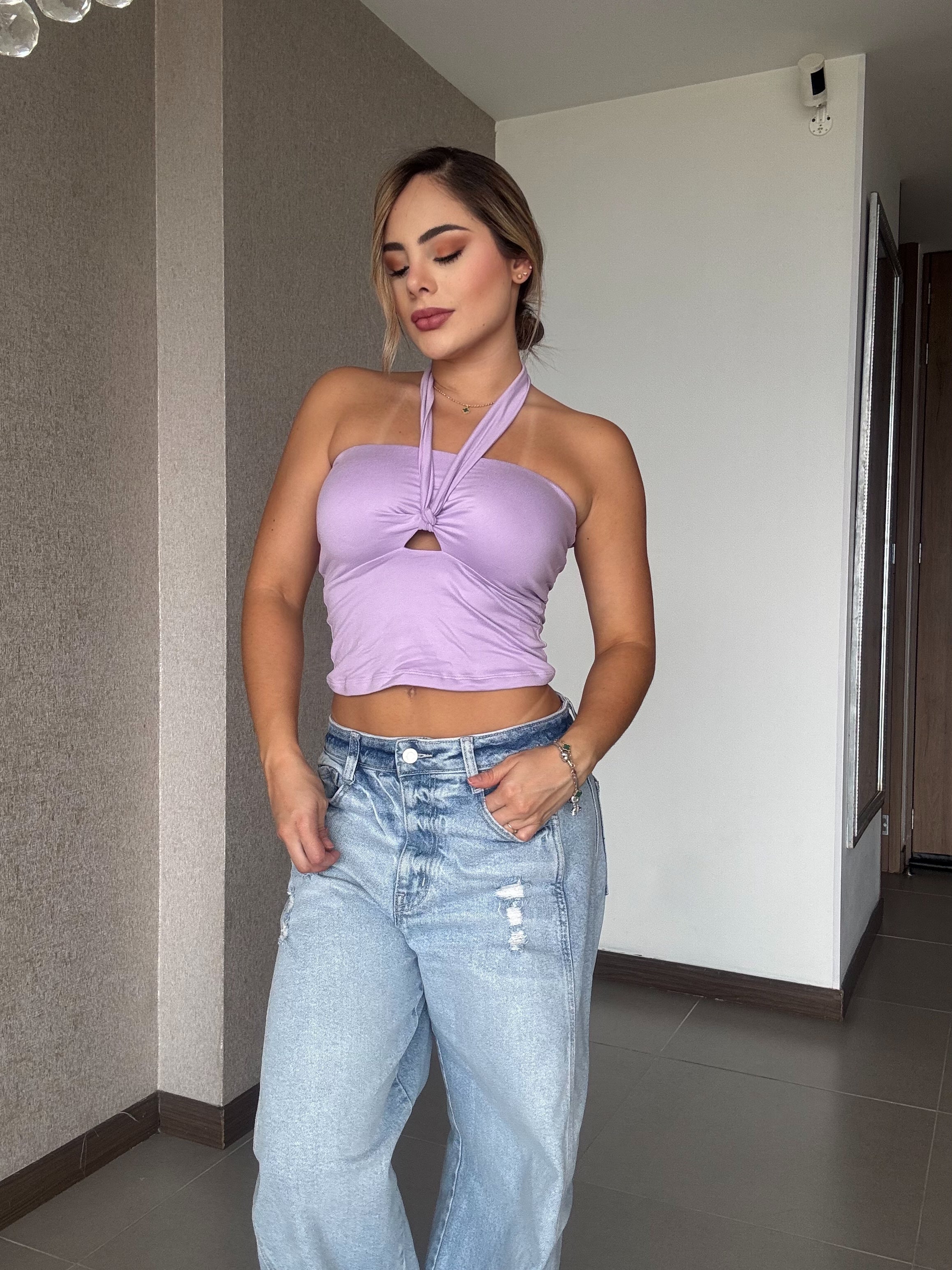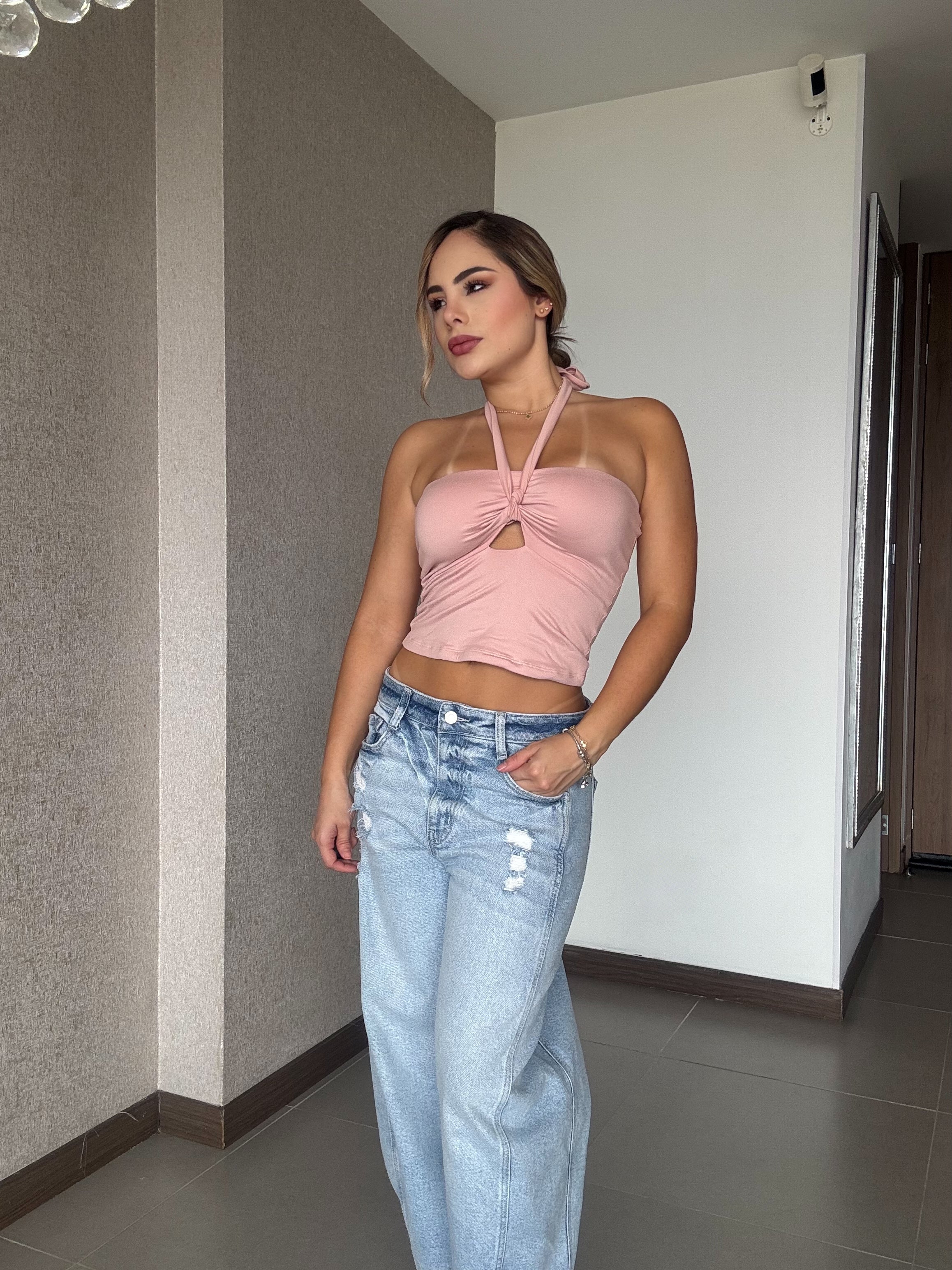 Blusa Con Drapeado En Copa, Escote Strapless Y Cargadera De Cuello